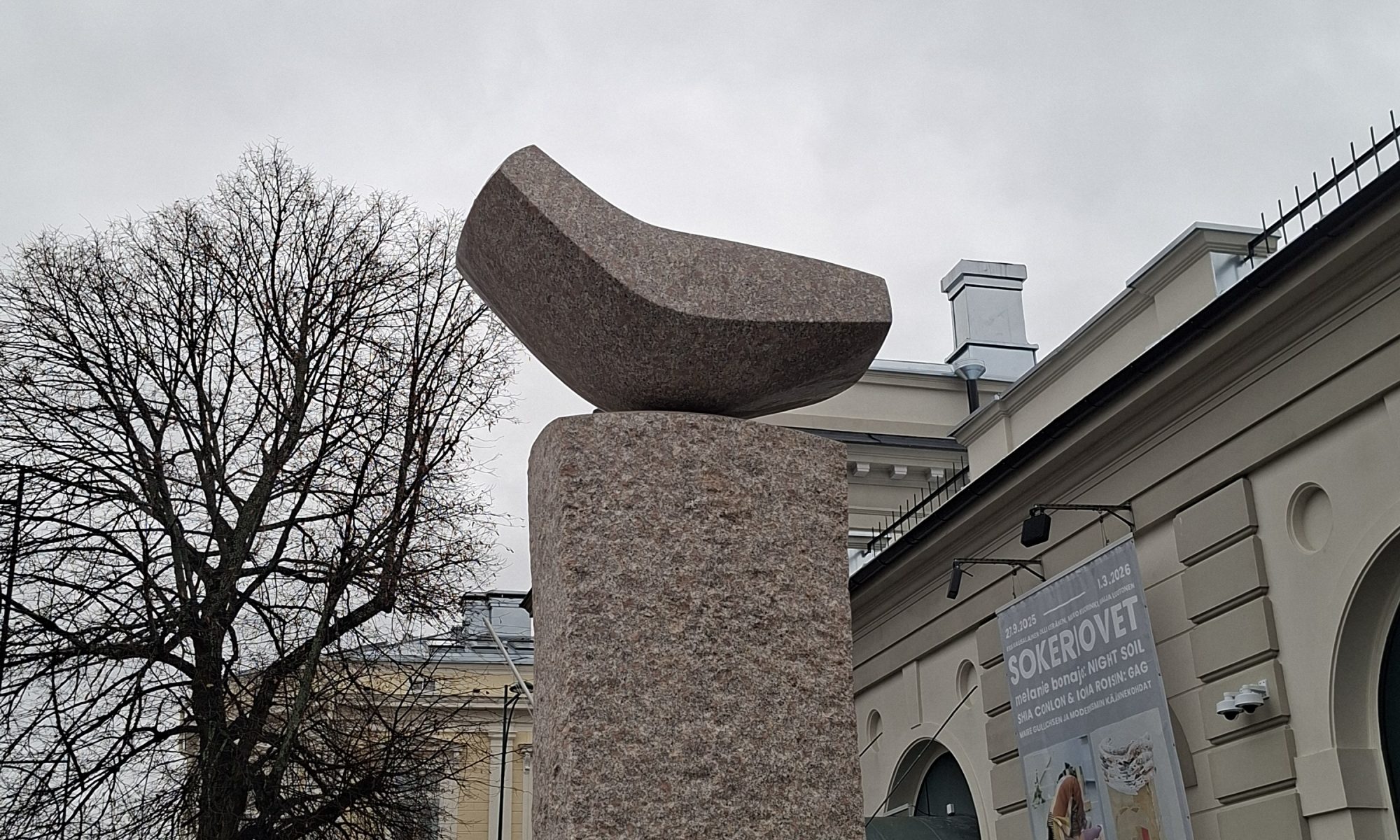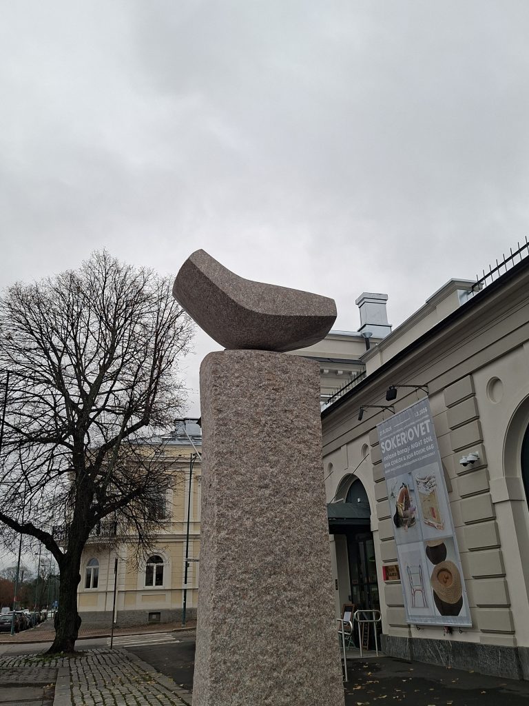 Kuva veistoksesta Lokki (Kivijärvi, 1987). Taustalla näkyy myös vähän Porin taidemuseota.