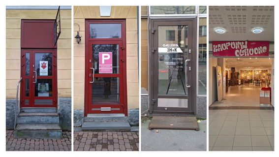 Kuvakollaasi Yrjönkadun gallerioista: Galleria Porin Saskiat, P-galleria, Galleria 3H+K ja Galleria Ars Pori.