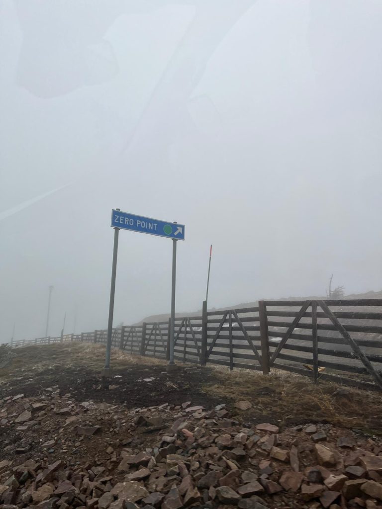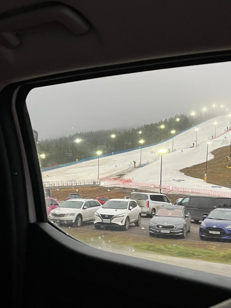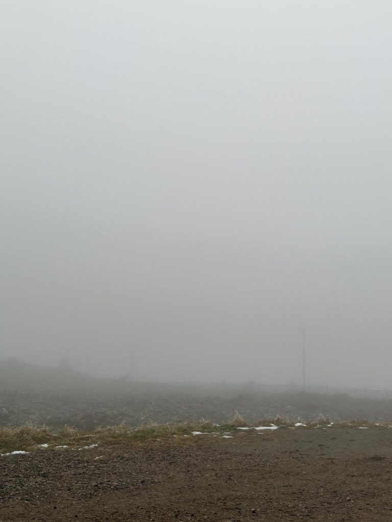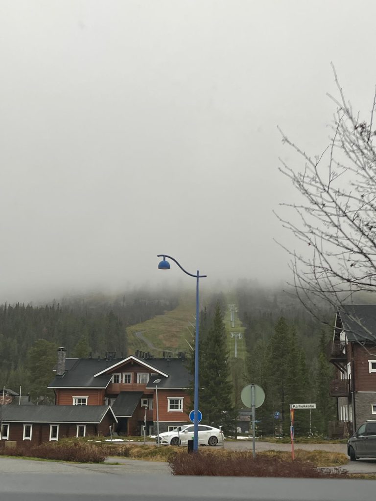 Lähdimme ajamaan kohti Levin tunturia sateisessa säässä. Ulkona oli alkanut jo hieman hämärtyä. Mitä korkeammalle ajettiin sitä enemmän oli sumua ja korvat meni lukkoon, kun jyrkkää rinnettä ajettiin ylös. Lopulta oltiinkin kokonaan sumu pilvessä. Lopulta pääsimme huipulle ja astuin autosta ulos. Maasto näytti erittäin karulta ja huipulla oli niin paljon sumua, että ei oikein näkynyt mitään. Oli kova tuuli ja hieman kylmä. Satoi vettä.