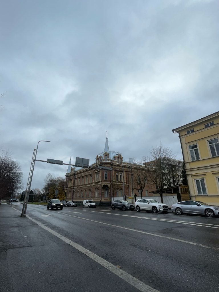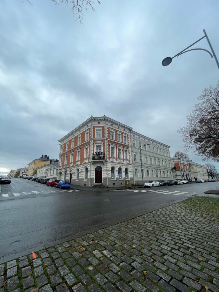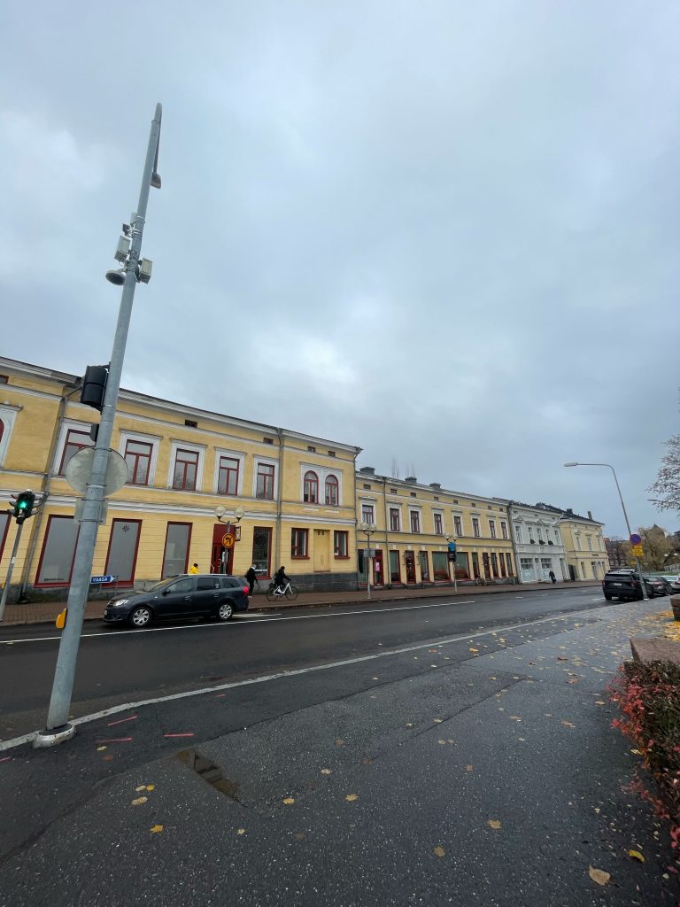 Kirkkopuistoa vastapäätä ovat Yrjönkadun taidegalleriat, jotka sijaitsevat kauniissa keltaisissa rakennuksissa, ja niissä on punaiset ikkunankarmit. Värit kyseisissä rakennuksissa ovat lempiasiani.