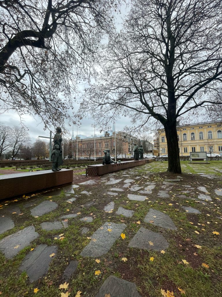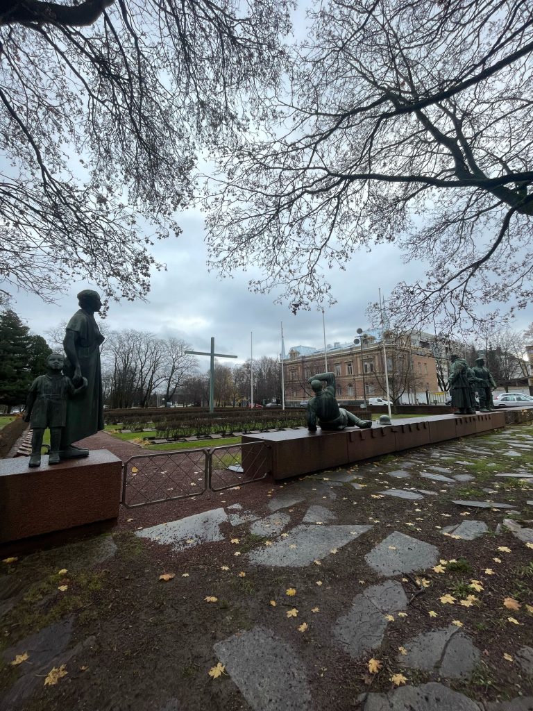 Koko kirkkopuiston alue on kaunis, ja sen yksi upea kohde on seuraavaksi reitillä olevat kirkkopuiston sankarihautamuistomerkki-veistokset. Ne on mielestäni tehty taidokkaasti kuvastamaan sodan jättämää tunnelmaa.